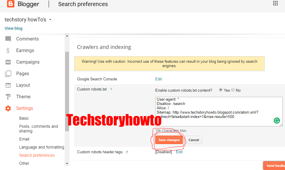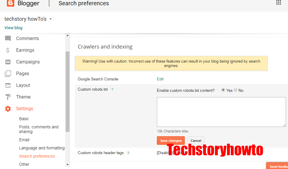 3. Now go to your blogger dashboard click on settings—> search preference and enable robot.txt option ( available in crawling and indexing section )