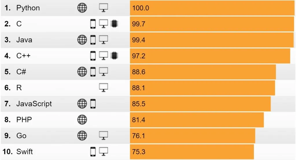 The above picture is the Ranking provided by IEEE Spectrum. According to that ranking, We have presented this article to you. The chart shows that Python stands out in the list because it was mainly used in machine learning.